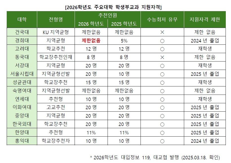 2026학년도 주요 대학 학생부교과 지원자격입니다